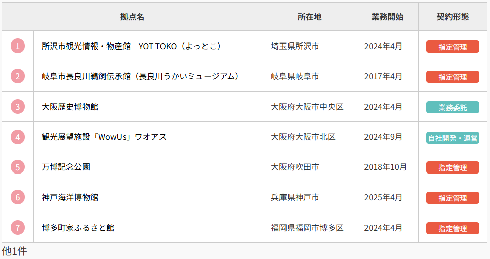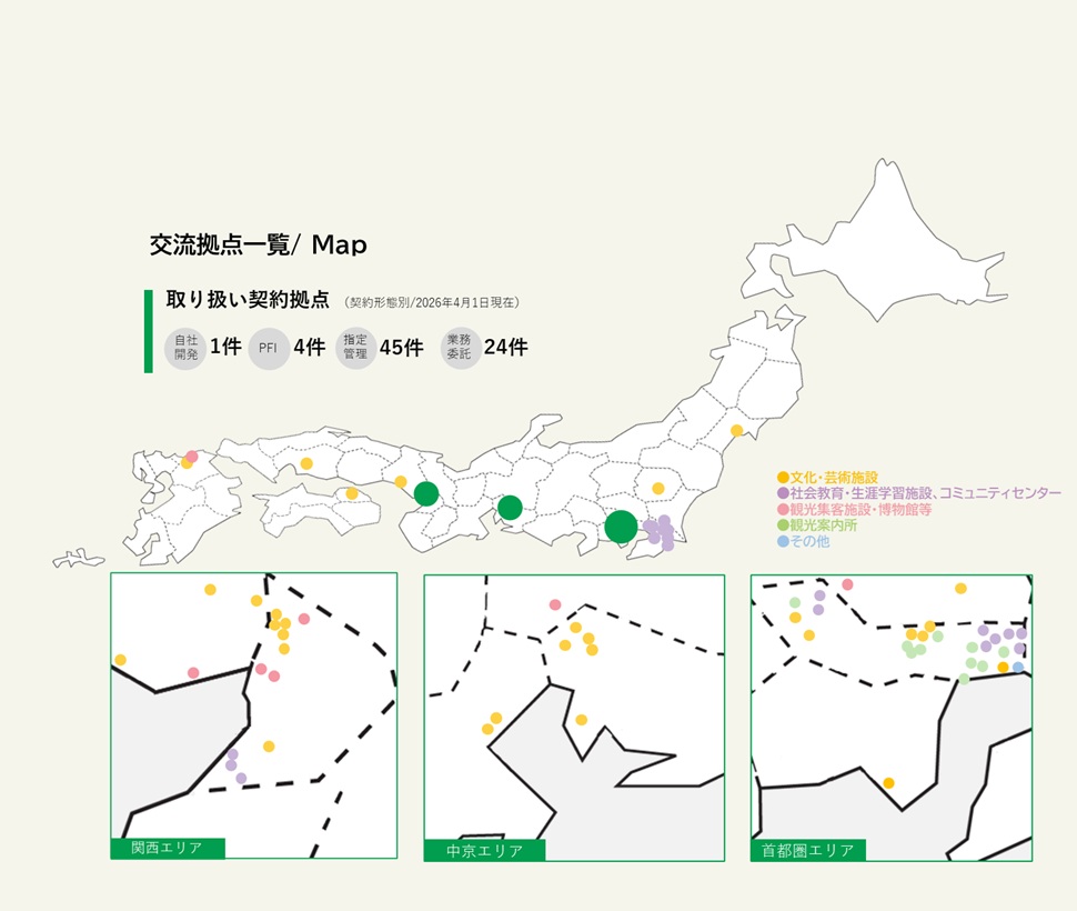 現在、全国各地の、公共文化・芸術施設をはじめ、民間の集客拠点、観光案内所など、多くの拠点の施設運営管理をお任せいただいております。