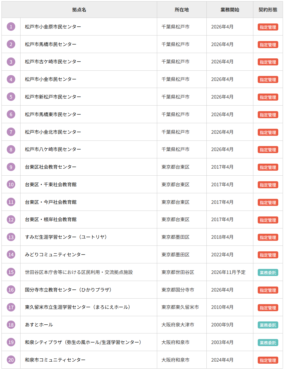 社会教育施設・生涯学習施設・コミュニティセンターの取扱い 計20拠点